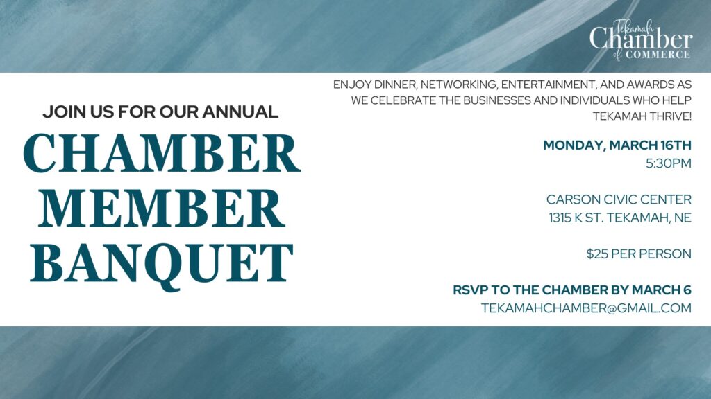 The Annual Tekamah Chamber of Commerce Member Banquet is almost here, and we are excited to invite our members and community supporters to join us for an evening of celebration, connection, and fun.