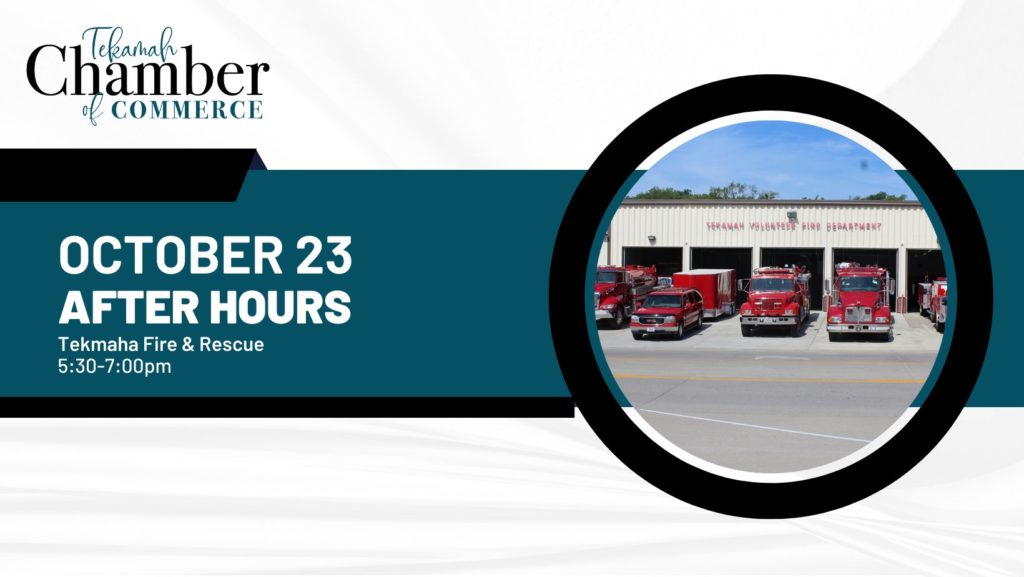October After Hours is this Monday, October 23rd, from 5:30-7pm hosted by and at Tekamah Fire and Rescue! Come network and build relationships with your fellow Tekamah businesses and Chamber members!